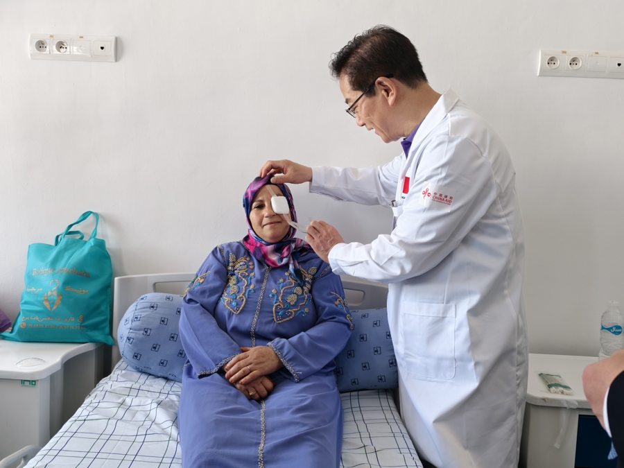 “看见了……真的看见了……”她喃喃道,手指无意识地攥紧了衣角。70多岁的皱纹里蓄满了欣喜,她裂开嘴笑了。这位老人受白内障困扰多年,视力仅剩光感。当得知中国医生要来开展眼科义诊,便在家人陪同下来到穆罕默德五世医院。