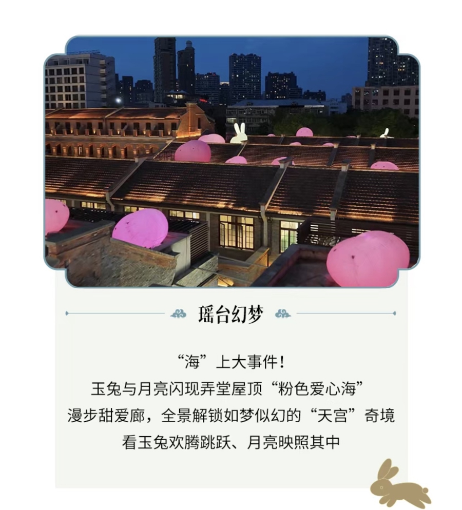 阖家欢聚、共赏灯会,是中秋必不可少的仪式。滨港商业中心今潮8弄连续第4年打造的“华灯共庆”海派中秋灯会,以“中国传统宫灯”为核心创作灵感,结合玉兔、月亮等节日意象,呈现多组超大型灯光艺术装置——在“甜爱廊”观景露台欣赏“瑶台幻梦”,看玉兔欢腾跳跃、月亮从屋顶粉色爱心海升起;在弄堂仰望以百年建筑为画布的“琼楼今潮”,巨型六角宫灯一字排开,极具空间感……缤纷灯组在传承与创新间点亮光影华章,让不同年龄、不同背景的市民游客皆可在华美且浪漫的视觉享受中,走近中国文化之美。