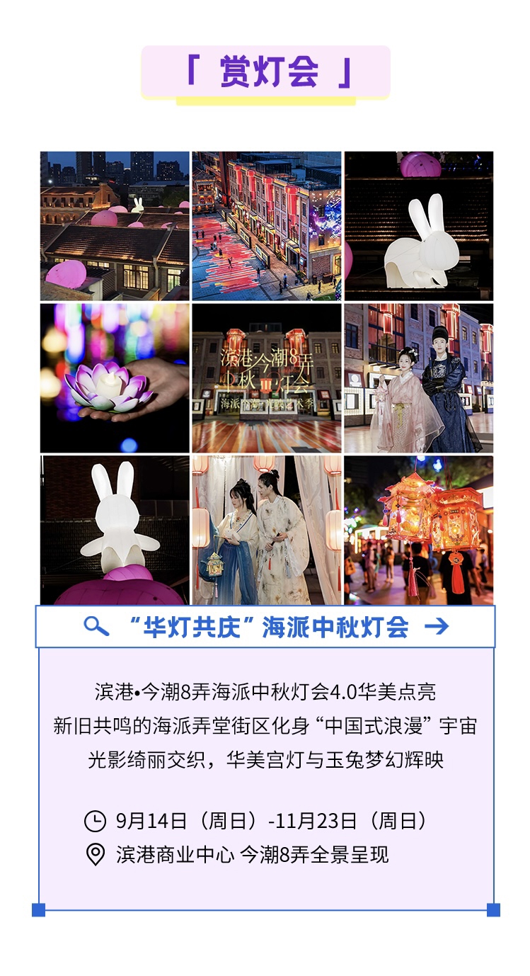 国庆长假期间,虹口区滨港商业中心今潮8弄将带来2025“海派今潮·光映艺术季”丰富节庆体验——赏灯会、看演出、游市集、玩工坊、逛灯铺、观风物、拍美照、光影秀、音舞秀、享福利,超百场活动接连登场,呈现“国庆8天乐、天天玩不停”的海派假日新玩法,持续打造沪上“海派中秋赏灯必打卡目的地”,邀请市民游客来四川北路,庆国庆佳节,过海派中秋。